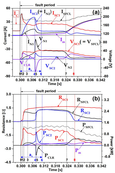 In Figure 6a,b, ‘0’ point is 0.3 [s], which is the point at which the fault starts. As soon as the fault occurs, the currents of both the SFCL and the first HTSC module (ISFCL, ISC1) increase sharply and reach their peak value at point ‘1’. At the same time, the first HTSC module is partially quenched, and after point ‘1’, it is completely quenched, as seen in its resistance and voltage waveform (RSC1, VSC1). Simultaneously, the voltage across CLR (VCLR) starts to rise rapidly after point ‘1’ and has a peak value at point ‘2’ where the current of the first HTSC module reaches its peak value. After point ‘2’, point ‘3’ represents the recovery point into its critical current after the current of the first HTSC module (ISC1) exceeds its critical current (IC). Additionally, point ‘3’ corresponds to the point at which the current of the second HTSC module (ISC2) arrives at its critical current (IC), as seen in Figure 6a.