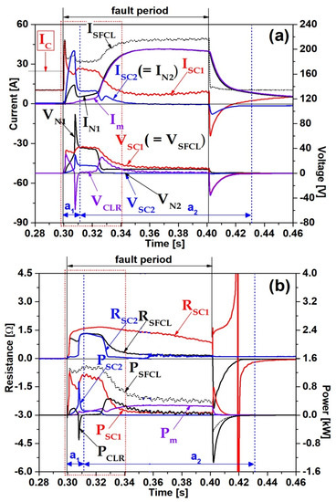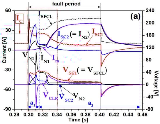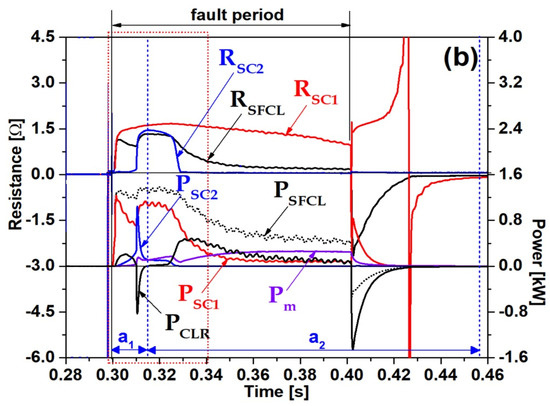 The second discharge period of CLR starts directly after the fault is removed. As soon as the second discharge starts, the voltage of the CLR (VCLR) greatly decreases and approaches a negative peak. After the negative peak, it approaches zero with a gradual slope, which is the second discharge period of CLR. Additionally, the voltage of the first HTSC module (VSC1) as well as its current (ISC1) have a similar waveform to the voltage of the CLR during the second discharge period, as seen in Figure 8a. Furthermore, the instantaneous power energy in CLR, which is charged for the second charge period, is confirmed to be discharged for the second discharge period, as displayed with ‘a2’ in Figure 8b.