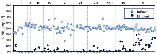 Temporal trend of influent and effluent N-NH4+, N-NO3−, and N-NO2− concentrations (mg∙L−1) measured daily along the ten experimental periods of the UAGSB reactor operation.