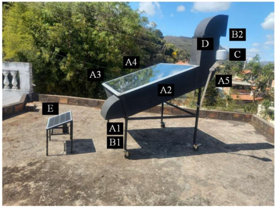 Picture of the active indirect solar dryer: (A1, A2, A3, A4, and A5) PT-100 temperature sensors, (B1 and B2) thermo-hygrometer, (C) pyranometer, (D) anemometer, (E) photovoltaic panel.