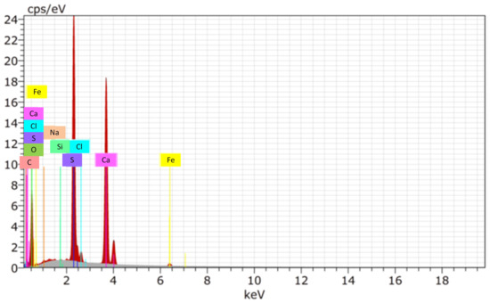 One of the techniques used to characterize the sample was X-ray diffraction; the analysis detected the presence of iron oxide (Fe2O3). The major element observed was iron (Fe), the minor elements were sulfur (S), carbon (C), and calcium (Ca), and the trace elements were oxygen (O), sodium (Na), silicon (Si), and chloride (Cl); these are shown in Figure 4. The excessive amounts and forms of these elements may cause negative environmental impacts. However, until now, steel-wire-drawing sludge is being sent to controlled landfills, generating transport costs and damage to the environment. Additional information about the elements found in the sludge sample are summarized in Supplementary Materials File SC.
