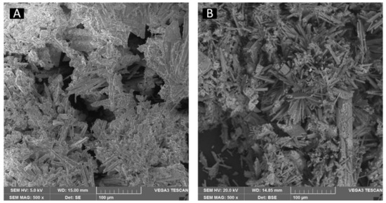 The microstructure of the sludge at room temperature showed different porosity trends and different surface morphologies. Figure 5A shows the appearance of coarse grains and the formation of glassy phases. However, it has a different morphology characterized by the appearance of coarse grains. And, Figure 5B presents a format that allows viewing the heterogeneity of the structure and non-conforming parts. This becomes possible with voltage acceleration from 5 kV to 20 KV, which better details the sample surface.