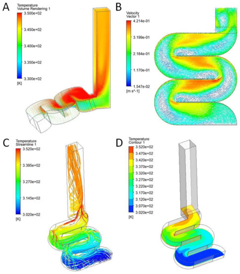 CFD simulation images of the solar dryer. (A) Temperature as a function of air volume; (B) temperature as a function of the velocity vector; (C) temperature as a function of simplified volume; (D) temperature depending on the baffle.