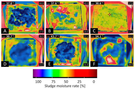 The validate the CFD simulation, a non-invasive analysis was performed with a thermographic camera. The boundary conditions of the CFD simulation were the same as the thermographic analysis, as shown in Figure 7. The temperature was intrinsically correlated with the fraction of mass and/or the volume of water (humidity) where the enthalpy (h) was the amount of energy found in the air flow of the drying process. Thermographic analyses of the sludge samples made it possible to investigate and compare their thermal behavior according to the variables of the drying process. The images were taken at three drying times on two different days, at 10:00 a.m., 12:00 p.m., and 4:00 p.m. on 28 March 2023, corresponding to Figure 7A–C, respectively, and at the same times on 29 March 2023, corresponding to Figure 7D–F, respectively.