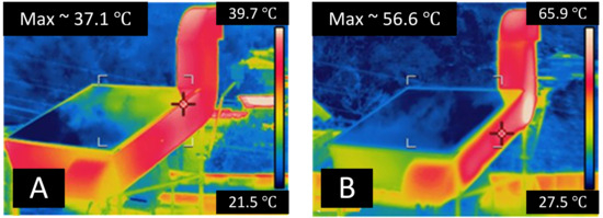 Thermal images of the solar dryer. (A) Conventional drying and (B) hybrid drying.