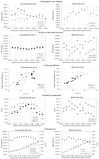 The testing phase occurred during the transition from winter to spring, coinciding with the onset of the rainy season in Brazil. This period represents intermediate environmental conditions in that country. As the rainy season commences, the air’s relative humidity rises, leading to varying drying conditions. This enables comparisons across different ranges of relative humidity. Figure 9 summarizes the observations for hemispheric solar radiation, mass air flow inside the device, thermal efficiency, outlet air temperature, and the drying curve during the experimental drying.