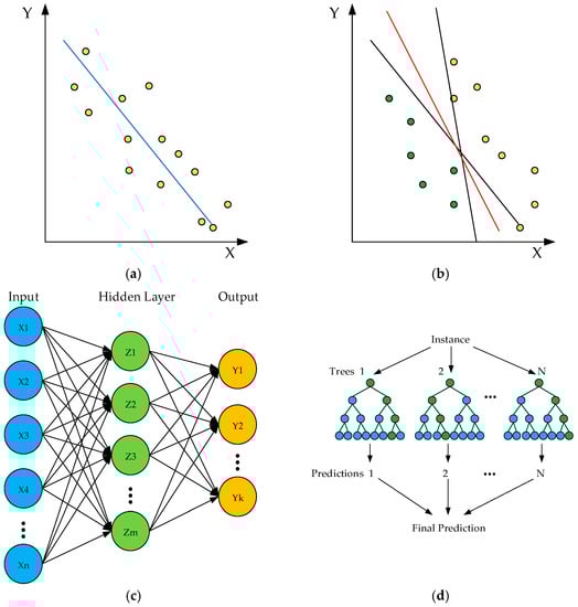 Several popular ML algorithms: (a) linear regression; (b) support vector machines; (c) artificial neural networks; (d) decision trees.