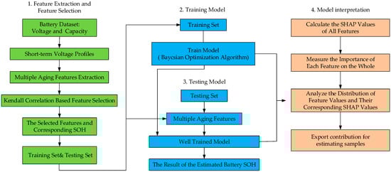 In [58], the authors used virtual experiments via transfer- and meta-learning to estimate the SOH of EV and improve the training efficiency for the remaining battery capacity based on pure data, while also emphasizing the robustness of the experiment. In [59], the authors used the battery early aging data to carry out DP identification and TL in the research, which effectively improved the accuracy of the SOH estimation. In addition, they also used the long short-term memory (LSTM) network to establish the SOH estimation model, and compared the performance with other ML algorithms. The experimental results indicate that LSTM performed best in estimation accuracy. In [60], the authors used a long short-term memory neural network model based on incremental capacity to estimate the SOH, which can predict the SOH of a single battery cycle for small sample data. Through TL, we can estimate the SOH under different load modes with high accuracy. In [61], the article proposed a health state estimation method based on collaborative feature selection and ML methods that was applied to actual EV data from over 1200 charging processes. After constraining the voltage range, they extracted and selected features from the capacity curve to describe the battery degradation process and estimate the SOH. Recursive feature elimination collaborates with linear regression models to prune unimportant features to find the relevant SOH estimation features. Therefore, the SOH estimation is based on the obtained features and the implementation of a low computational cost linear regression. In [62], the authors proposed a new SOH estimation method, which was divided into two stages. In the first stage, eight typical 300 s voltage distributions were used to describe the entire charging process and multiple aging features were extracted. Then, a stacked ensemble model with five basic models was introduced. In the second stage, the Shapley additive interpretation method was used to obtain the contribution of features and understand estimations, thereby reducing concerns about applying black box models. In summary, this new method achieved flexible, fast, and robust SOH estimation. The performance of the proposed model was verified using two different battery degradation datasets and the results showed that the accuracy of the proposed model was better than conventional ML models including light gradient boosting machine (GBM), eXtreme gradient boosting (XG Boost), RF, SVM, and GPR. The frame diagram of the algorithm is shown in Figure 3.