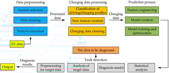 In [71], the author used a symmetrical circuit topology structure to detect short circuit faults within a parallel series hybrid battery pack. This theory can accurately locate faults and provide necessary signals for detection and troubleshooting. By using an additional ammeter to detect an unbalanced current, it is possible to determine whether there is an internal short circuit. The recursive least squares algorithm is used to lock the faulty unit online, and the effectiveness of the algorithm at the grouping level is demonstrated through experimental verification by replacing the internal short circuits. This method can effectively and accurately detect the internal short circuit fault of the battery, and has great application potential in the fault diagnosis of battery packs in large-scale energy storage systems. In [72], a data-driven method was proposed for battery charging capacity diagnosis based on massive real-world EV operating data, as shown in Figure 4.
