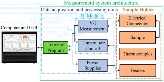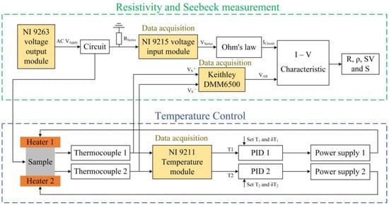The system automation and control in the experiment utilize the LabView graphic program, which is responsible for various tasks such as collecting, displaying, processing, and storing experimental data during the sample’s characterization process. Serving as an intermediary between the computer and the hardware components, its main objective is to autonomously control and measure the temperatures at the cold and hot ends of the sample, while conducting SV and R measurements. The block diagram presented in Figure 4 illustrates the temperature control and measurement procedure, representing the measurement protocol responsible for controlling all instruments and implementing methods within the measurement system. The NI 9211 module receives signals from the thermocouples and transmits them to the PID control system. The PID control system utilizes DC voltage sources to control the heaters, effectively regulating the temperature gradient of the sample. Simultaneously, the NI 9263 module applies an AC voltage to the circuit, while the NI 9215 module measures voltage signals across the series resistance and calculates the circuit current using Ohm’s law. Additionally, the Keithley DMM6500 digital multimeter acquires voltage signals from the thermocouples, accurately representing the thermoelectric voltage at both ends of the sample. By acquiring I–V characteristics around the target temperature, the system enables the simultaneous determination of R, , SV, and S.