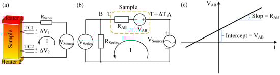 (a) Schematic diagram showing the principle of resistance and Seebeck voltage measurements. (b) Equivalent circuit, consisting of a thermoelectric potential and an internal resistance. (c) I–V curves of a thermoelectric sample under a constant ΔT.