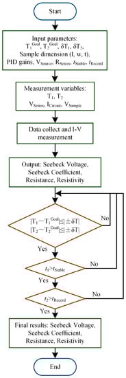 Figure 5 illustrates the flowchart of the program used in this study. The experimental procedure is based on the four-point probe testing method, utilizing I–V measurements to obtain the Seebeck coefficient and resistance of the sample. The program begins by setting various parameters, including the desired hot end temperature (T1Goal), desired cold end temperature (T2Goal), accuracy of hot end temperature (±δT1), accuracy of cold end temperature (±δT2), sample length (lSample), sample width (wSample), distance between two thermocouple probes in the sample’s height direction (hSample), proportional gain, integral time, derivative time (PID gains), AC voltage (VApply), stable time (tStable), and record time (tRecord). Then, during the testing process, the program continuously reads the hot end temperature (T1), cold end temperature (T2), series voltage (VSeries), circuit current (ICircuit), and sample voltage (VSample). Based on these collected data, the I–V characteristic of the sample is obtained, allowing for the determination of resistance, resistivity, Seebeck voltage, and Seebeck coefficient.