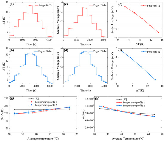 Figure 6 presents a series of experimental results conducted on P-type Bi-Te samples over a temperature range from room temperature (RT) to 70 °C. These average temperatures, depicted in Figure 6, are the mean value of the cold-end and hot-end temperatures. Figure 6a,b display two temporal profiles implemented to create temperature gradients between the hot and cold ends of the sample. The corresponding SV generated under these temperature profiles and gradients is shown in Figure 6c,d. The trends in SV changes align with the trends in temperature gradient changes, indicating a proportional relationship between them. The clear linearity observed in Figure 6e,f not only suggests ohmic contact between the probe and the sample but also indicates the successful operation of the constructed apparatus. Figure 6g,h compare the measured Seebeck coefficient and electrical conductivity values of the P-type Bi-Te sample obtained using our testing system with the reference values (measured by a ZEM-3 commercial system) provided by the ingot manufacturing company [50]. The intention behind comparing the measurements obtained from this measurement system with those from the ZEM-3 commercial system was to demonstrate the relative accuracy and reliability of the apparatus. This paper emphasizes that the comparison is intended to demonstrate general agreement rather than absolute equivalency. The maximum difference in S and σ observed is estimated to be within 9.9% and 9.6%, respectively, over the entire temperature range of the measurements.