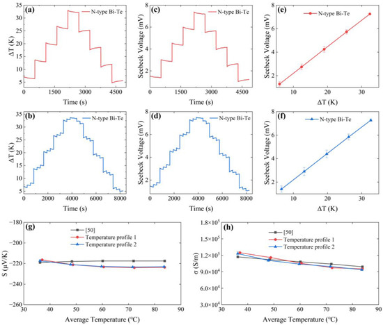 (a,b) Temporal temperature profiles 1 and 2 of the applied temperature difference (ΔT) between the cold and hot ends of an N-type Bi-Te sample. (c,d) The corresponding generated Seebeck voltage (SV) of temperature profiles 1 and 2. (e,f) Plot of SV versus ΔT for temperature profiles 1 and 2. (g,h) Comparison of the measured Seebeck coefficient (S) and electrical conductivity (σ) over a temperature range.