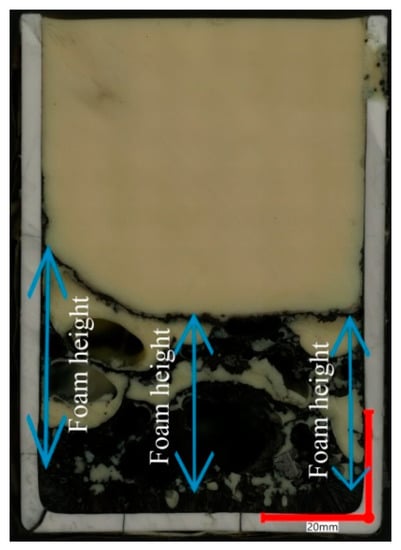 The foaming height was estimated after the experiments, and the volumetric gas fraction contained in the foam was also calculated using Equation (4), according to [39,40].