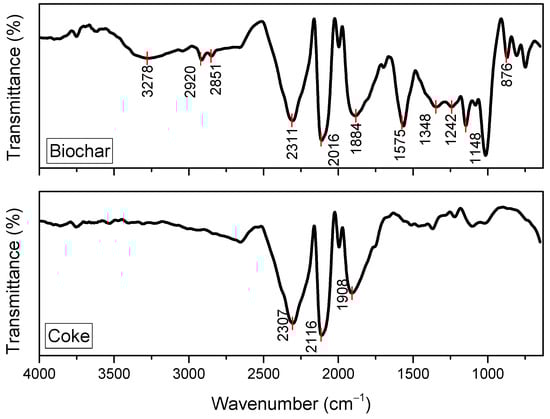 The two carbon sources, namely, coke and biochar, are investigated using an FTIR spectroscopy, and the spectra are presented in Figure 2.