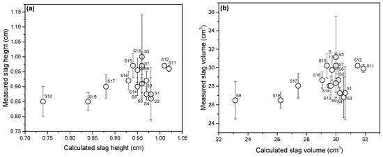 (a) Comparison between calculated slag height and measured slag height. (b) Comparison between calculated slag volume and measured slag volume.
