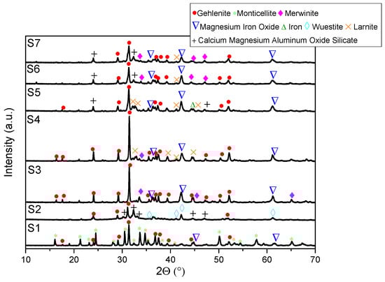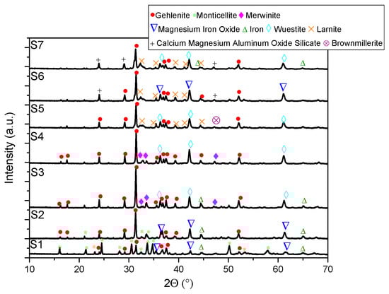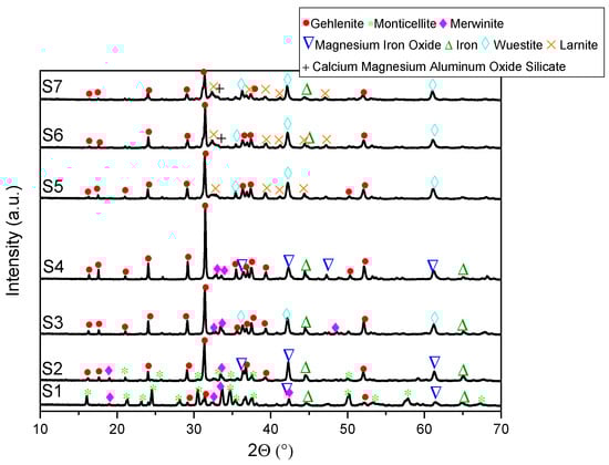 Among the slag foams S1–S7, the commonly identified phase is gehlenite (Figure 5). It can be concluded that monticellite and magnesium iron oxide are predominant in slag foam samples, with the highest MgO content. The presence of monticellite is detected only for slag foam samples where the lowest basicity was applied. Additionally, merwinite occurs in samples with the lowest basicity it aligns with [49].
