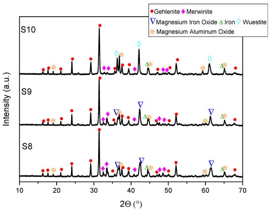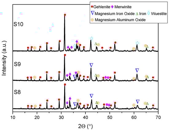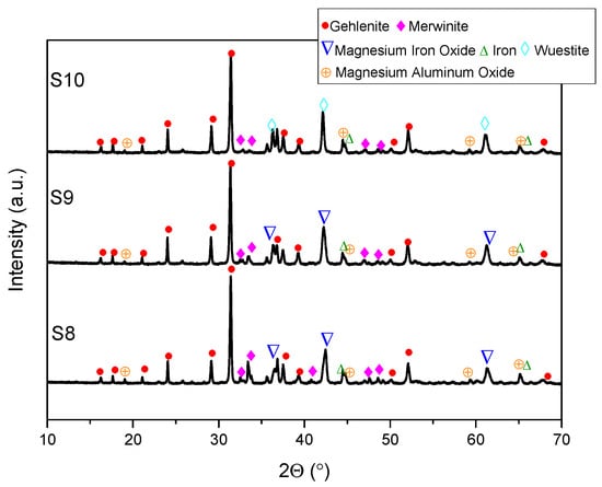 Figure 6 illustrates detected phase patterns in slag foam samples with stable basicity and Al2O3 content. The relatively high content of MgO likely influenced the formation of two spinels (magnesium iron oxide and magnesium aluminum oxide) in all three slag foam samples.