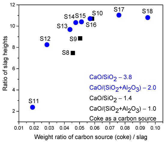 Figure 7 depicts the correlation between the ratio of the slag heights and the weight ratio of coke/slag for a series of slags with varying FeO content, with coke utilized as the carbon source. The data reveal a general tendency for the weight ratio of coke/slag to increase as the ratio of slag heights increases; for slag containing 50 wt.% FeO, a slight decline in this tendency is observed.
