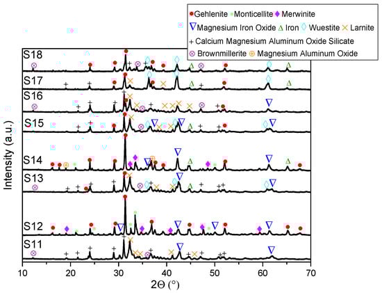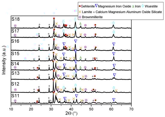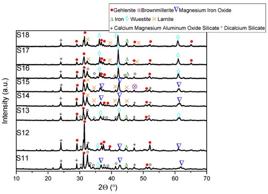 For samples of slag foam in the case of using slags with different content FeO and stable basicity, it was identified that slag foams S11, S13, S14, S16, and S17 consist of gehlenite, calcium magnesium aluminum oxide silicate, larnite, magnesium iron oxide, and brownmillerite (Figure 18). Additionally, the presence of the wuestite phase was detected for samples S12, S13, and S18. The peak corresponding to metallic iron was detected for slag samples S14, S15, and S18.