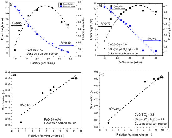 Foam height (coke as a carbon source) and foaming index as a function of (a) basicity and (b) FeO content of slags; relationship between relative foaming volume and gas fraction of slags with stable FeO content (c) and basicity (d).