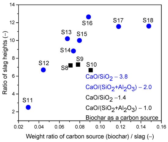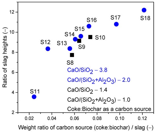 Figure 17 shows the correlation between the ratio of slag heights, the weight ratio of coke and biochar/slag, and a set of slags with different FeO content. Generally, as the ratio of slag heights increases, there is a tendency for the weight ratio of coke and biochar/slag to slag heights to also increase. However, it is noteworthy that for slags containing 50 wt.% FeO, unlike the behavior observed with coke, the weight ratio sharply increases in this case.