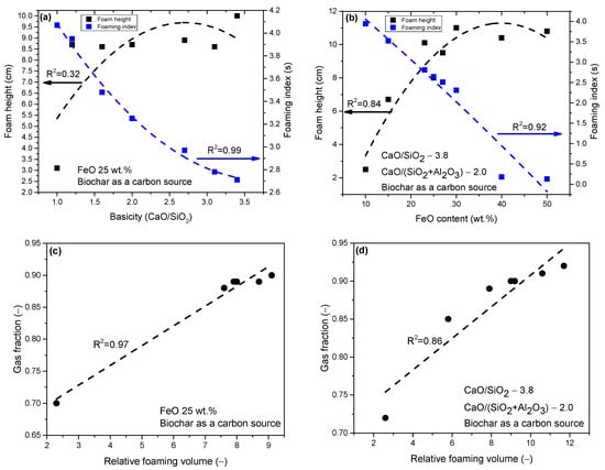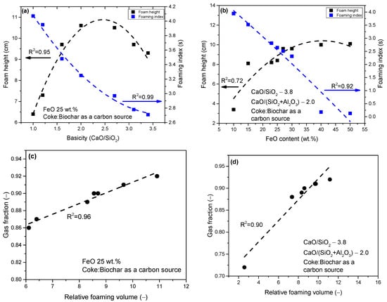 Foam height (mixture of coke and biochar with a ratio of 1:1 as a carbon source) and foaming index as a function of (a) basicity and (b) FeO content of slags; relationship between relative foaming volume and gas fraction of slags with stable FeO content (c) and basicity (d).
