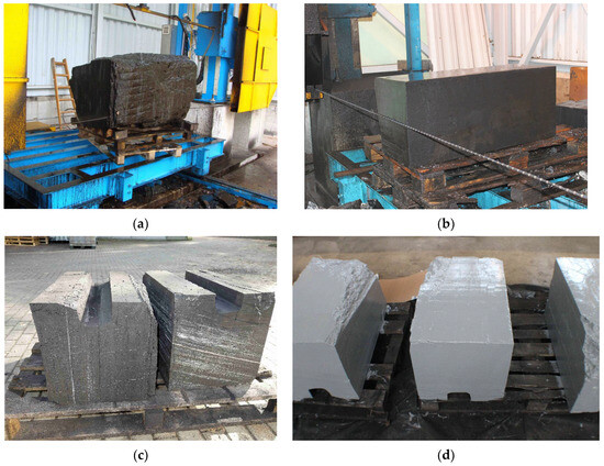 Preparation of artificial coal seam for sorption tests: (a,b) sample cutting, (c) cut blocks of coal with a sorption channel, (d) fully painted blocks of coal prepared for sorption testing.