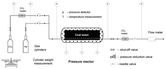 To complement the in situ experiment, which exhibited the aforementioned limitations, a controlled laboratory test was conducted. The high-pressure laboratory installation enabled the simulation of CO2 injection in underground conditions at the surface (ex situ) into an experimental coal seam. This setup aimed to determine the coal’s sorption capacity and observe the dynamics of CO2 migration. The large coal blocks were placed inside the insulated reactor, preventing gas losses outside the experimental zone. The size of the experimental coal seam, combined with the reactor’s capability to operate at a high pressure of 30 bar, allowed for the simulation of coal–gas interactions. A longitudinal sorption channel was cut in the lower part of the prepared coal seam to emulate the design of a horizontal injection well. Inlet and outlet gas flow, temperatures, and pressures were also monitored as crucial operational parameters.