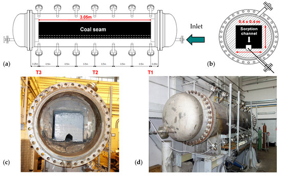 Pressure reactor for sorption testing: (a) side cross-section, (b) vertical cross-section, (c) reactor with coal seam inside, (d) reactor ready for the CO2 sorption test.