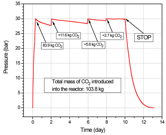 It can be seen from Figure 5 that, with each successive addition of CO2 gas, there was a decreasing trend in the reactor’s pressure drop, and the volume of CO2 introduced during each cycle also reduced. The total amount of CO2 introduced into the reactor was 103.8 kg. The total sorption time was 10 days. After the outlet valves were opened, the time for the pressure in the reactor to drop to atmospheric was 3 days. The amount of CO2 released from the reactor was measured with a gas meter at all times. Despite the fact that the pressure in the reactor equalized to atmospheric levels, carbon dioxide continued to escape from the reactor, as indicated by increasing values on the gas meter. It was determined that desorption would end if three consecutive CO2 volume measurements, taken approximately every 8 h at the exit from the reactor, showed no increase in the amount of desorbed gas. This time was 7 days. The total time for carbon dioxide to be released from the reactor was therefore 3 + 7 = 10 days.