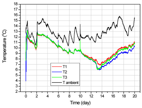 From the graph in Figure 6, it can be seen that the temperatures T1–T3 for the duration of the test are very close to each other and their changes are proportional to changes in ambient temperature. It can be seen that the temperature in the reactor increased with each cycle of carbon dioxide introduction. This occurred because the ambient temperature and the temperature of the introduced CO2 were higher than the temperature inside the pressurized reactor. The apparent fluctuation in ambient temperature is due to the 24-hour cycle of heating up the air during the day and cooling down at night. The average temperature inside the reactor during CO2 sorption test was 11.6 °C.