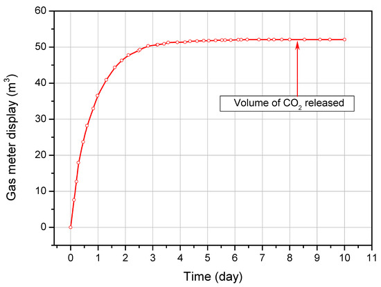 Figure 7 shows the relationship between time and the volume of pressurized carbon dioxide released from the reactor into the atmosphere. The measurements continued from the opening of the reactor outlet valves until the gas meter stopped indicating a volume increase. This time lasted 10 days.