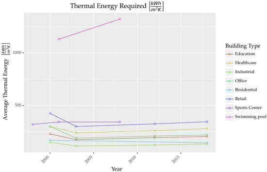 In a comparable study undertaken in Greece, Trianti–Tsourna and colleagues [] observed, based on scrutinized data from five swimming facilities, mean annual energy consumption rates of 450 kWh/m2 for floor area and 1094.5 kWh/m2 for water surface area, along with an average annual electricity use of 57.5 kWh/m2 per floor area. These observed variations could be ascribed to regional climatic conditions as well as inconsistencies in the employed Key Performance Indicator (KPI) calculation methods. Furthermore, the study noted that straightforward architectural modifications, such as enhanced wall and roof insulation, window shading, and increased natural ventilation, could mitigate cooling requirements by up to 45%.