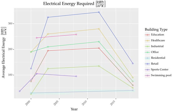 Trianti–Stourna [] presented energy conservation strategies for sports halls, emphasizing retrofitting methods to enhance energy efficiency. Among the recommended retrofitting interventions are architectural modifications such as insulating external walls, introducing south-facing clerestories, adding sun spaces, shading openings, and enhancing natural ventilation. The study also underscores the importance of installing economizers and heat recovery systems where suitable. They reported that at the time lighting systems could benefit from the use of well-maintained metal halide lamps. Large sports halls, in particular, can leverage passive solar interventions to meet a significant portion of their annual heating and cooling needs. Furthermore, the integration of energy-efficient techniques in existing Heating, Ventilation, and Air Conditioning (HVAC) systems, including the use of economizers, heat recovery systems, and Building Energy Management Systems (BEMS), is advocated. In terms of energy consumption metrics, the research indicates an average annual total energy consumption of 73.2 kWh/m2 (calculated over the entire facility area). Specifically, the heating energy consumption average was calculated based on the heated room area and it was found to be 322.3 kWh/m2 annually, while the electrical energy consumption stands at 37.14 kWh/m2. The difference between the total energy consumption and the heating energy consumption in kWh/m2 is because in the denominator different areas are used (the heated areas are smaller than the total area). This also highlights a potential pitfall of the energy efficiency research, i.e., that metrics are easy to be constructed however they are not always directly comparable or do not permit certain numerical calculations, that would otherwise seem intuitive. Similar results are reported in Sweden for swimming pools [,].