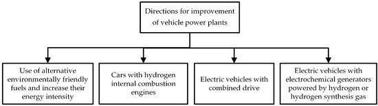 The global shortage of oil and environmental problems determine the importance of the application of more economical and ecological technologies in transport, including technologies for the improvement of power plants as the most energy-intensive vehicle component. Lutsyk et al. [45] considered four main areas of improvement of vehicle power plants, which are presented in Figure 2.