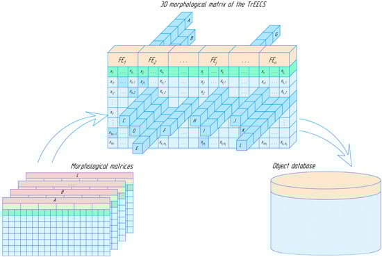 The authors in [1] present a mathematical transformation of the classic morphological model into a fuzzy rule base for evaluating, controlling, and forecasting the energy efficiency of vehicles. This transformation cannot be implemented for the TrEECS 3D model. A solution to this issue is the use of the TrEECS object database. The optimal configuration of the system can be determined by solving the optimization problem according to the criterion of energy efficiency of the vehicle (Figure 5)
