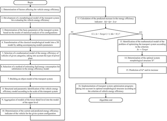 The vehicle is considered a functional element of the transport system that interacts with its other elements. Based on the results of the work, five main groups of factors influencing the vehicle energy efficiency were identified: vehicle technical features, vehicle operating characteristics, road, traffic environment, and traffic flow. These groups were selected as functional elements of the transport energy efficiency control subsystem (TrEECS) in the intelligent transport system. A significant group of researchers single out the driving style as an element of influence on the vehicle energy efficiency. Therefore, it the investigation of driving parameters is planned and these parameters will be added to the system morphological model. The elements of the transport system can be part of other systems. This feature was used to build the concept of a 3D morphological model. This model was obtained on the morphological structure of the basis of the transport system, to which parameters of conjugated morphological structures were added. In this case, the transition from a morphological model to a mathematical one is difficult. One of the directions of further research is the development of an alternative system object model and a module for choosing a method of evaluating the vehicle energy efficiency under given operating conditions. The analysis of the scientific sources showed that the vehicle energy efficiency can be a criterion for optimizing other system elements, particularly roads. Therefore, the system configuration is not static. It is recommended that the system be periodically improved according to the optimization algorithm (Figure 5). When forming a morphological model, only independent parameters of the system should be taken into account. For this, the Farrar–Glober algorithm should be used. The scheme of the algorithm is presented in [14]. It is better to calculate the energy efficiency indicator according to formula (7). This indicator is universal. To calculate its denominator, it is necessary to select a method for estimating energy/fuel consumption. At the same time, it is advisable to use Table 5, Table 6 and Table 7.