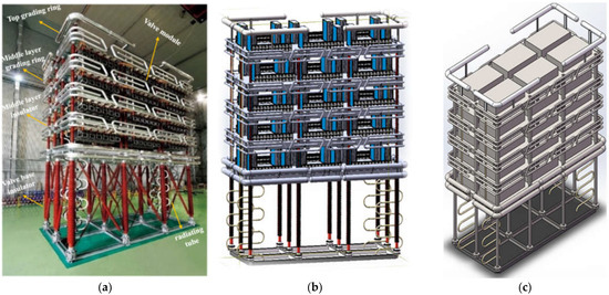 Flexible DC converter valve structure. (a) True structure of valve tower. (b) Valve tower 3D model. (c) Simplified 3D model of converter valve.