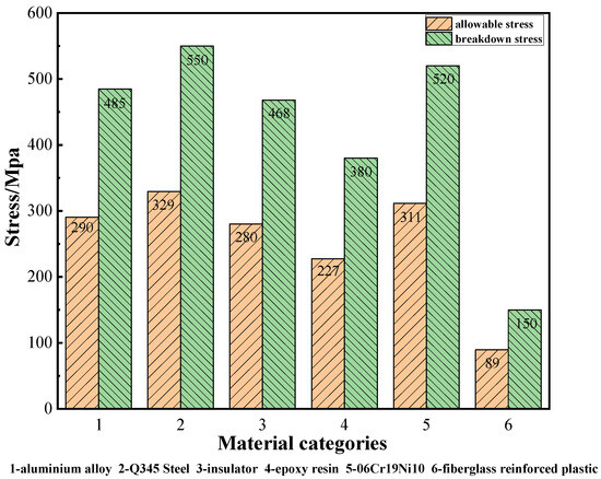 The material properties applied in the 3D model of the valve tower are shown in Table 1. According to the requirements of “Technical Specification for Seismic Design and Installation and Maintenance of Shock Absorber for UHV Porcelain Insulated Electrical Equipment” (Q/GDW 1132-2013) [26], the allowable stress is calculated by dividing the damage stress of the material by 1.67, and the relationship between the two is shown in Figure 2.