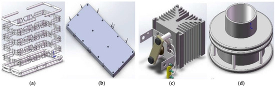 In this paper, the flexible DC supported converter valve is designed according to the converter valve used in the ±500 kV/3000 MW high-voltage DC power grid project. The structure is shown in Figure 1a. The valve base support height of the valve tower is 4300 mm, the valve top support height is 5800 mm, and the overall outline size of the valve tower is 8800 mm × 4000 mm × 11,900 mm. The whole valve tower adopts a supported structure, which is mainly composed of a pillar insulator, fixed base, bus bar, tray, valve assembly, and other components, while the valve assembly is composed of a large number of thyristors and heat dissipating pipes in series. The 3D model of the valve tower is shown in Figure 1b.