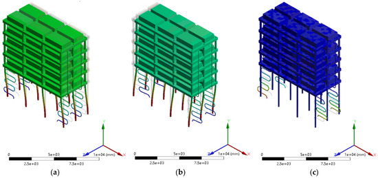 The software ANSYS Workbench was used to carry out a modal analysis of the structure of the supported valve tower and to solve for its first eight orders of self-oscillation frequencies and periods as shown in Table 2, and the characteristics of the vibration changes occurring in the valve tower are shown in Table 3. Further simplification of the valve tower model reveals that because of the obvious change in self-oscillation in the first 3 orders, Figure 4 only shows the first 3 orders of modal vibration of the tower after the second simplification, where the colored solid part is the tower after the change in vibration offset, and the light transparent shaded part is the valve tower before the vibration. Figure 5 shows the first 3 vibration modes of the valve tower for one-way observation, and the scale on the left of the figure is the displacement value of the valve tower vibration mode, which is only a measure of the relative value of the valve tower displacement, but not the real value of the valve tower displacement. In fact, the primary and secondary simplified model of the valve tower has little effect on the modal calculation and is only simplified to observe the modal change more clearly.