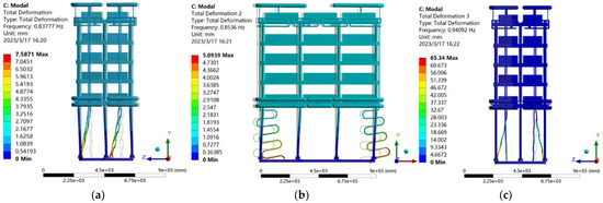 Three-order vibration pattern before the valve tower. (a) First order. (b) Second order. (c) Third order.