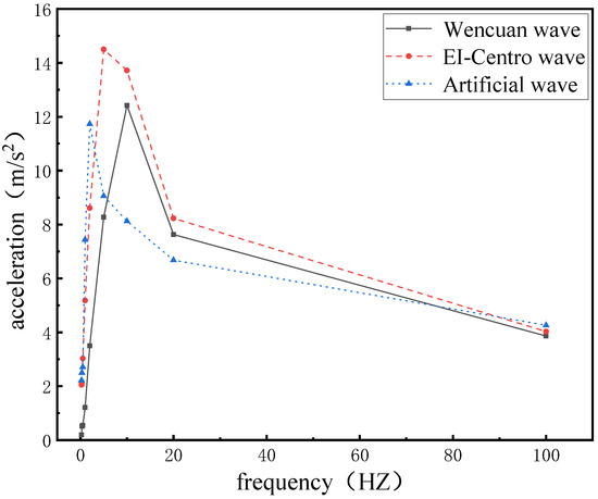 Data conditions: seismic intensity 8; input peak acceleration 0.4 g horizontal seismic wave along the Z-direction; characteristic period of 0.35 s; using a standard damping ratio of 5% for the structure; and the maximum seismic impact factor αmax is 1. The input seismic excitation must be selected in strict accordance with the “Code for seismic design of electrical installations” (GB50260-2013) [28], with a minimum of three input seismic acceleration time curves. Because the total duration of a single seismic wave time curve is not less than 30 s and the strong shaking time is not less than 6 s, Wenchuan seismic waves (2008, N-S, 0–30 s data) and EI-Centro seismic waves (1940, N-S, 0–30 s data, referred to as “EI” in this paper) and the artificially synthesized seismic waves (2021, N-S, 0–30 s data) were used as the three excitation inputs of the time-domain analysis; the three seismic wave peaks were adjusted to 4.0 m/s2 at last. Figure 6a–c shows the acceleration time profiles of Wenchuan, EI-Centro, and synthetic seismic waves, respectively, while Figure 7 shows the acceleration frequency response spectra of the three seismic waves at nine frequency points. The characteristic parameters of ground motion are calculated according to the seismic wave time curve and seismic influence coefficient curve, as shown in Table 4.