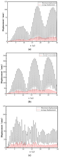 The distribution of the maximum total displacement under the excitation of three seismic waves. (a) Wenchuan. (b) EI-Centro. (c) Artificial.