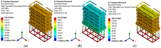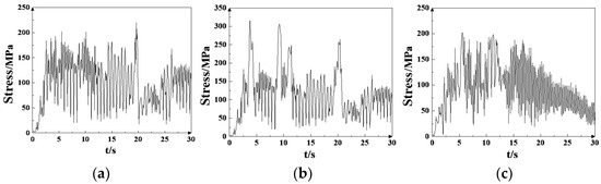 This is an in-depth comparative analysis of the seismic stress response under the same site characteristics. In the following figures, (a), (b), and (c) show the seismic action of Wenchuan, EI, and artificial waves, respectively, while Figure 10, Figure 11 and Figure 12 show the stress time variation, maximum stress response, and maximum displacement response distribution of the valve tower in turn.
