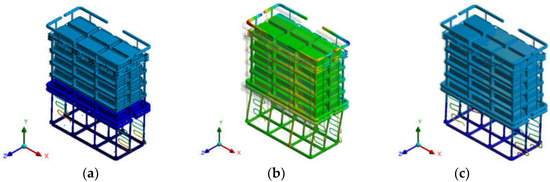 The 3D model of the valve tower after a simplification is shown in Figure 1c. Quadratic simplification will appear in the modal analysis. For the larger internal dimensions of the valve tower, the mesh was set slightly coarser (30 mm), and the mesh model was dissected using tetrahedral cells.
