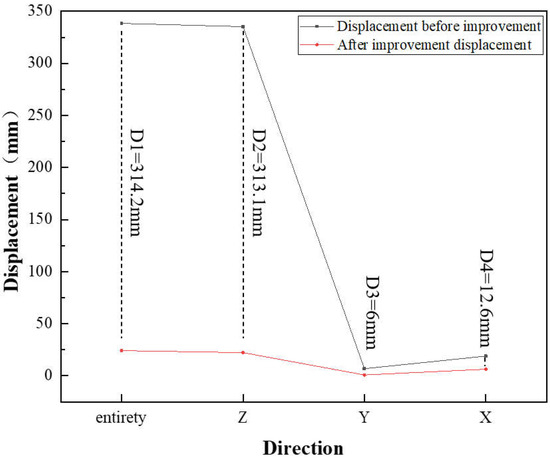 As shown in Figure 13, it can be seen from the displacement response perspective that the overall total displacement of the valve tower structure is reduced from 338.3 mm before the improvement to 24.1 mm after the improvement, while the absolute values of deformation quantity in x, y, and z directions are reduced by 313.1 mm, 6 mm, and 12.6 mm, respectively, compared with the absolute values of deformation before the improvement, indicating that the overall valve tower structure does not experience any large deformation after the improvement. This indicates that the overall structure of the improved valve tower has no large displacements and inelastic deformation, and is less deformed and more stable than the original one.