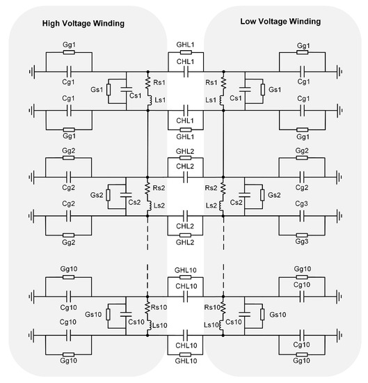 - Shibuya, Y.; Fujita, S. High frequency model and transient response of transformer windings. In Proceedings of the IEEE/PES Transmission and Distribution Conference and Exhibition, Yokohama, Japan, 6–10 October 2002; Volume 3, pp. 1839–1844. [Google Scholar] [CrossRef]